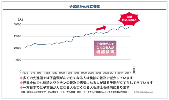 その間日本では子宮頸がんの患者数は増加を続け、年間約1万人もの女性が子宮頸がんにかかり、毎年3000人近くの人が亡くなってします。スウェーデンやオーストラリア、英国などでも、子宮頸がん予防の有効性が確認され、ワクチンと子宮頸がん検診とを合わせて普及させることにより子宮頸がんの患者数は確実に減少を続けています。